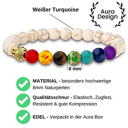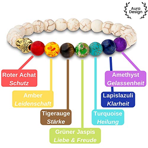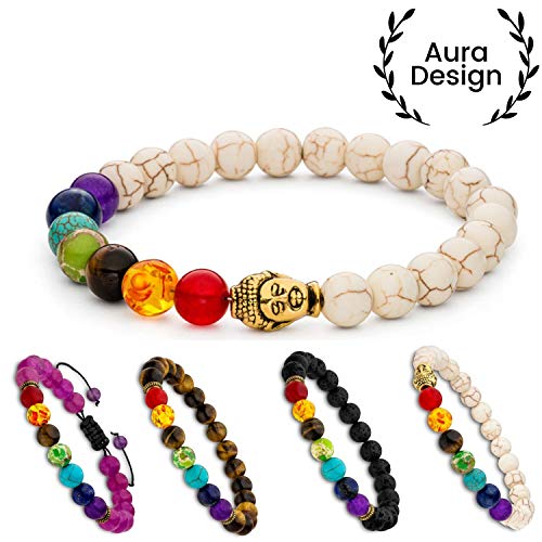Aura Design 7 Chakra Perlenarmband für Damen und Herren – edle Naturperlen – Yoga Armband – Meditation – Buddha Armband – Stein Armband – [19,5 cm Umfang] & [8 mm Perlen]