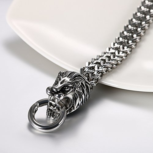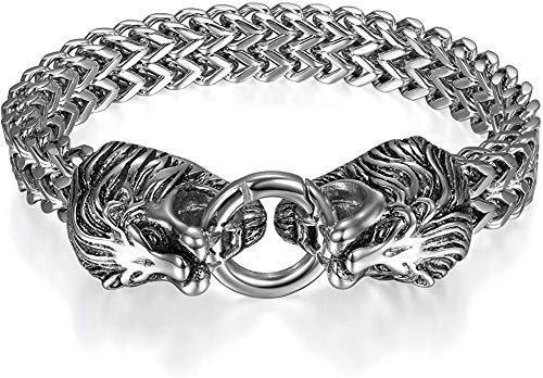 Details: JewelryWe Schmuck Herren Armband, Gotik Biker Doppelt Löwen Kopf Panzerkette Königskette Armkette, Edelstahl, Farbe Silber