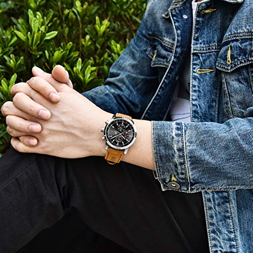 - ★ PREMIUM QUALITÄT: Die analoge Chronograph mit Quarzwerk bietet einen edlen Look. Das Gehäuse besteht aus hochwertigem Edelstahl. Das Zifferblatt verfügt über eine integrierte Datumskalenderfunktion, die Datum und anzeigt. Der Riemen ist weich und angenehm zu tragen.